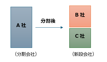 既存会社(分割会社)の資産・権利義務・出資者/株主を分けて、2社以上の新会社を設立する方式です。分割後、分割会社は消滅します。