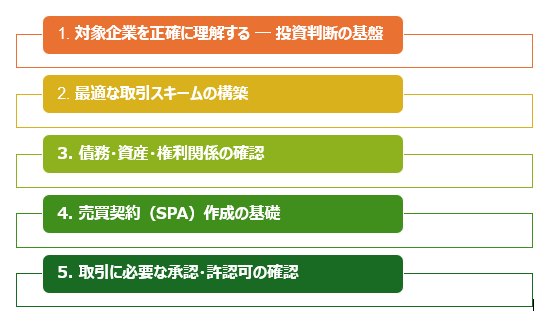 その目的は、投資家が対象企業の事業内容、財務状況、法的構造、潜在的リスクを多面的に把握し、正確な投資判断および適正な企業評価を行うことにある。